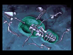 kosti mrtvé želvy, které byly před chvílí vyvrhnuty mořskou obludou, tak aby